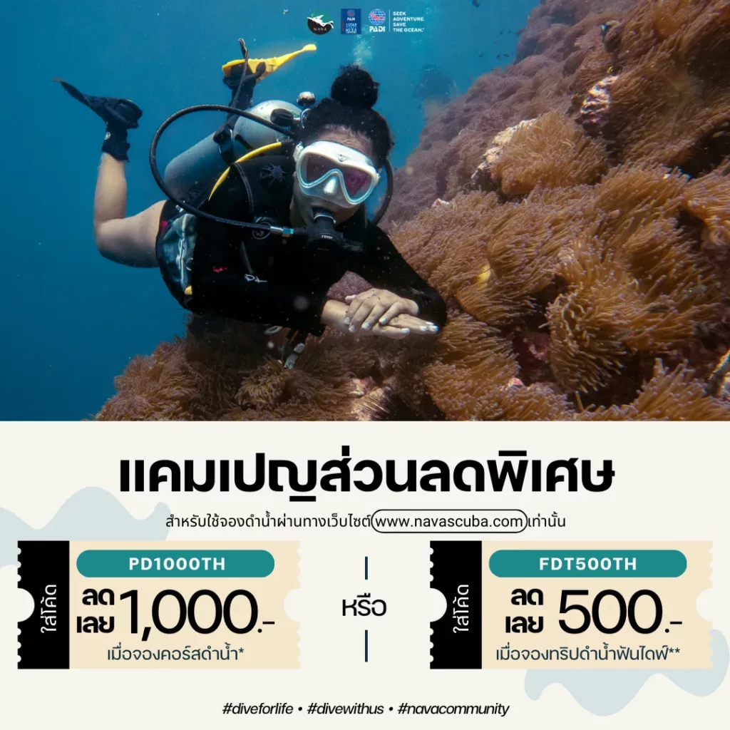 Utilisez le coupon de réduction pour 1 000 bahts de réduction lors de la réservation d'un cours de plongée PADI avec Nava, sans minimum requis, ou utilisez le code de réduction spécial pour les cours de plongée PADI. 500 Baht de réduction lors de la réservation d'un séjour de plongée à Koh Tao.